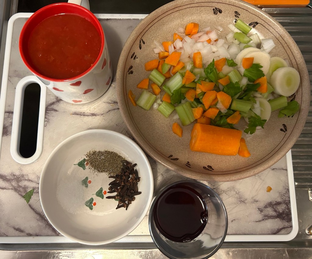 Mentre la carne lessa, tagliamo le verdure e e prepariamo tutto l’occorrente che verrà messo in padella: ho tagliato carote, sedano, cipolla e porro, messo in una ciotola le spezie (sale, pepe e qualche chiodo di garofano), un goccio di vino rosso e, in una tazza la passata di pomodoro allungata con acqua.