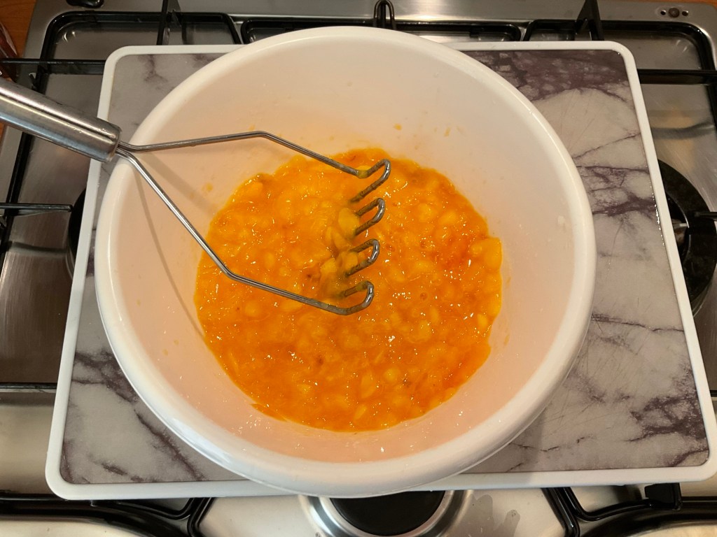 Pelate il cachi e tagliatelo a pezzi avendo cura di togliere i semi; mettetelo poi in una ciotola e andare a frullare o schiacciare la polpa, arrivando a una consistenza quasi liquida.