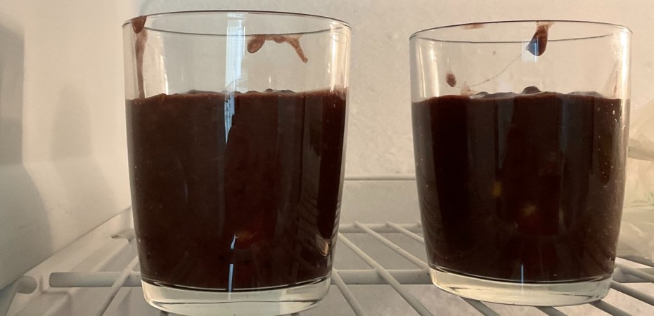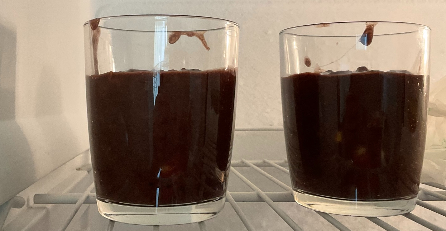 Una volta terminato, travasate il composto in delle formine o dei bicchieri/tazze (io ho usato dei classici bicchieri da tavola) e metteteli in frigo per almeno 4 ore, per permettere al budino di rassodarsi grazie al freddo. Raggiunto il tempo di riposo, i vostri budini al cacao e cachi sono pronti per essere gustati a merenda o come dolce alla fine del pasto.