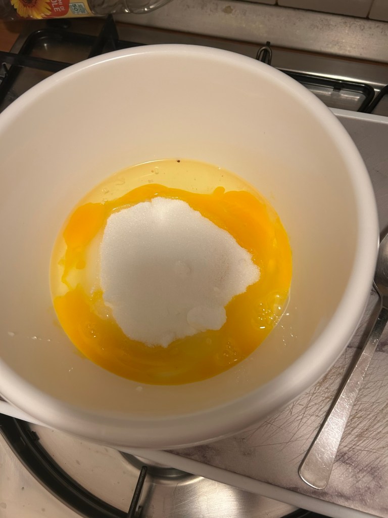 Per prima cosa è necessario amalgamare uova e zucchero: mettete entrambi gli ingredienti in una ciotola e mescolateli insieme, usando una frusta a mano o una elettrica a velocità molto bassa. Il composto da ottenere dovrà essere chiaro.
