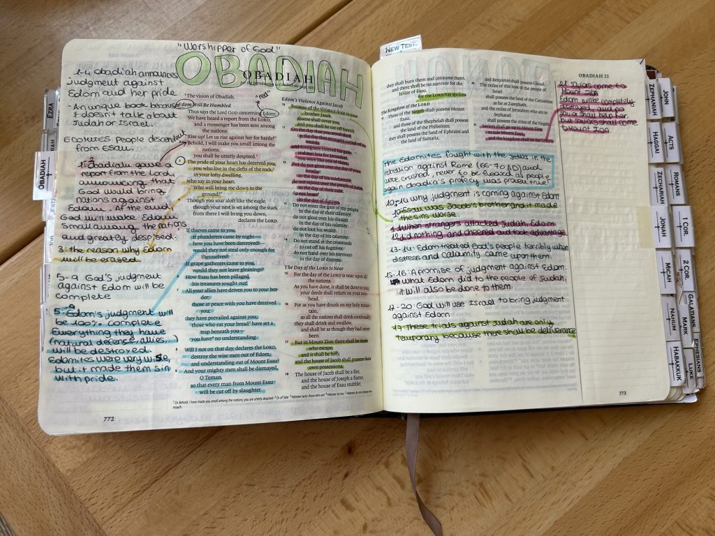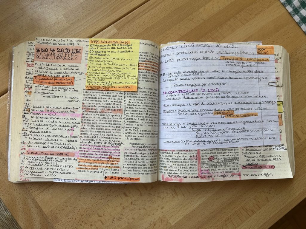 Ultimo suggerimento è l’utilizzo di una Bibbia come diario, o forse sarebbe meglio dire come archivio: che ne dite di una Bibbia pensata esclusivamente per prendere appunti durante le predicazioni o gli studi biblici? Io sono una persona con una soglia dell’attenzione veramente bassa e a lungo andare l’idea di perdermi parti importanti dei sermoni ha iniziato a darmi molta frustrazione, facendo nascee in me la necessità di segnare da qualche parte tutto quello che ritenevo importante durante il culto e durante le attività che facciamo in chiesa. Quello che faccio è portare con me ogni domenica un quadernino su cui prendere appunti, i quali vengono successivamente trascritti su una Bibbia da journaling in italiano edita ADI Media. Non amo questa versione perché le Scritture sono divise in troppi volumi e il tipo di carta non si presta molto ai colori e agli evidenziatori, ma può essere una buona base in quanto non serve tradurre nulla.