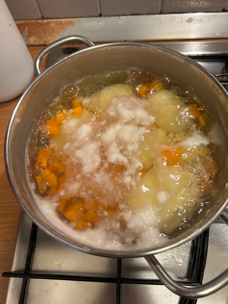Per prima cosa mettiamo a bollire uova, patate e carote. Per le seconde vi consiglio di pelarle subito e di tagliarle a pezzi grossolani in modo da velocizzare la cottura; per le seconde, evitate di fare come ho fatto io e non rompetele quando le mettete in acqua. Le uova devono essere molto sode.