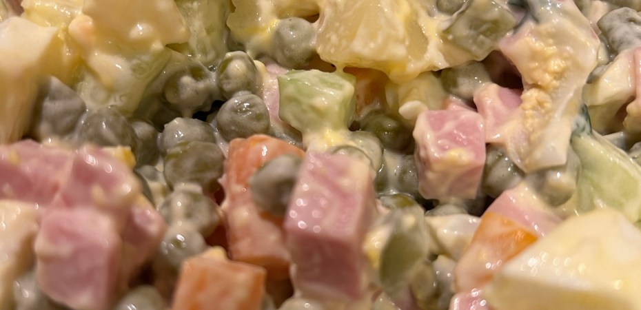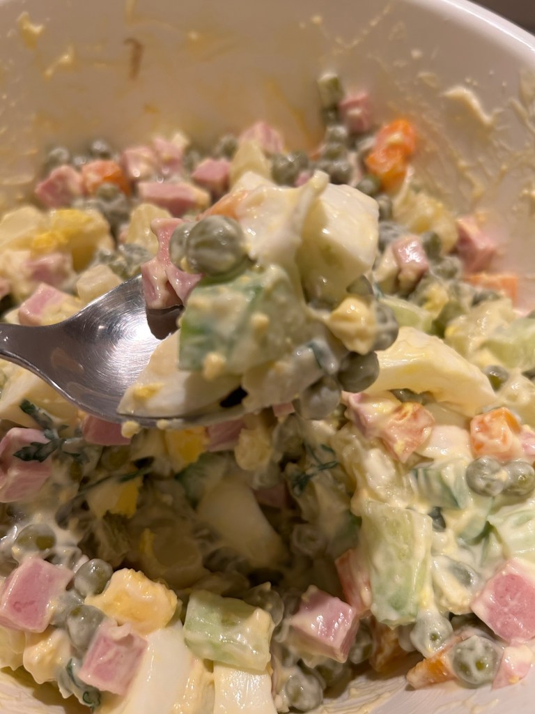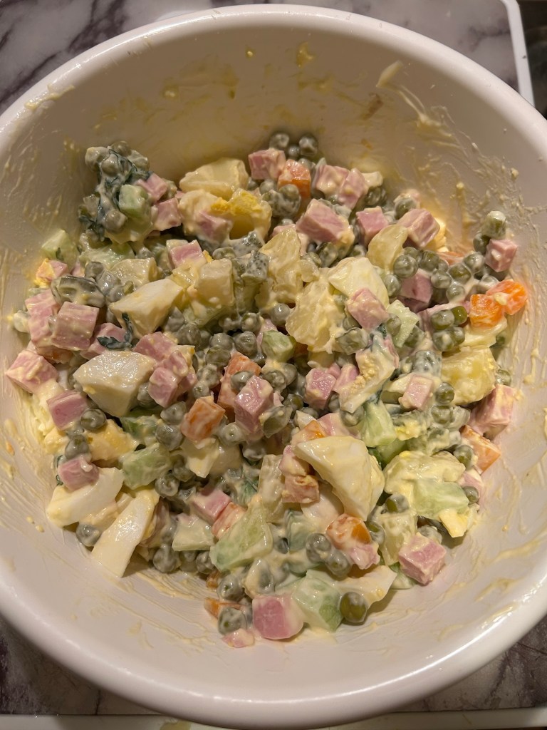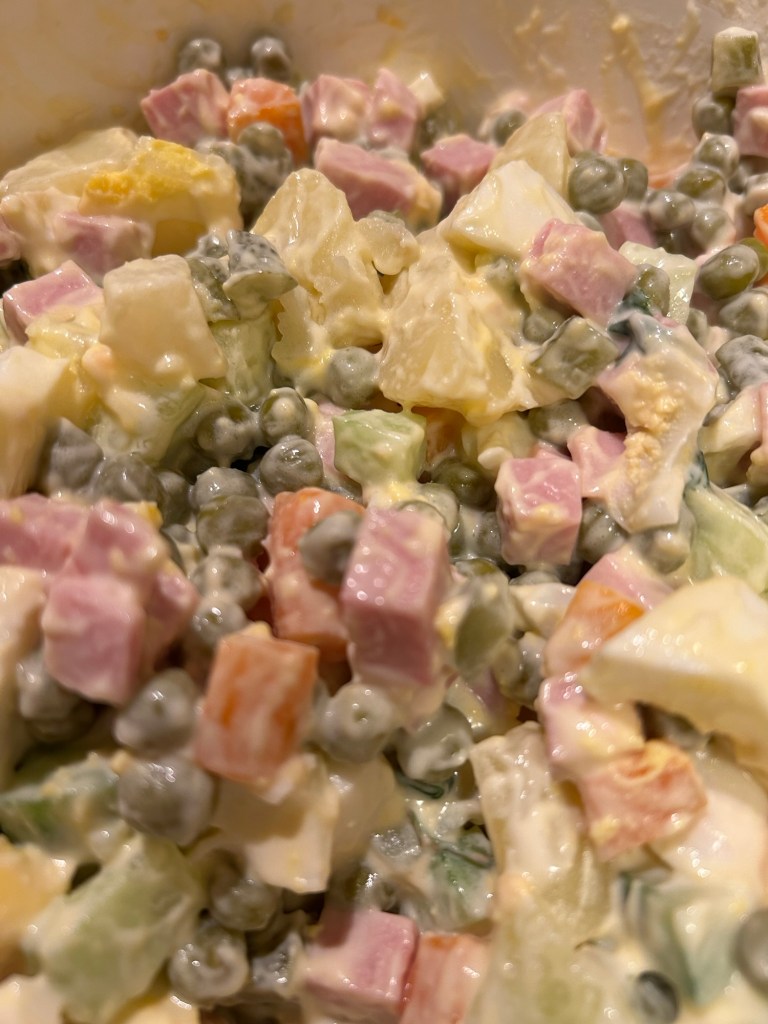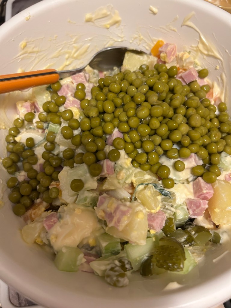 Dopo aver perso le diottrie per tagliare, è tempo di assemblare: inserite tutti gli ingredienti in una ciotola (tranne i piselli, che andranno alla fine) e mescolateli con la maionese. A differenza della variante italiana questa non deve affogare gli ingredienti, ma deve solo fungere da collante. Se pensate che la dose iniziale non sia sufficiente aggiungetene, ma con parsimonia.