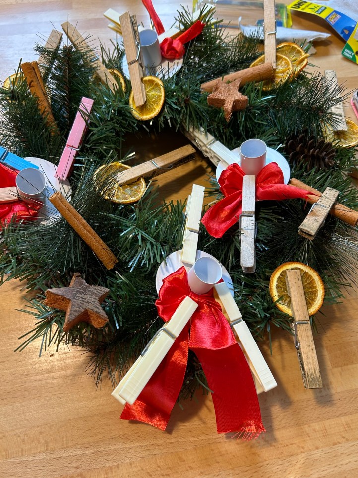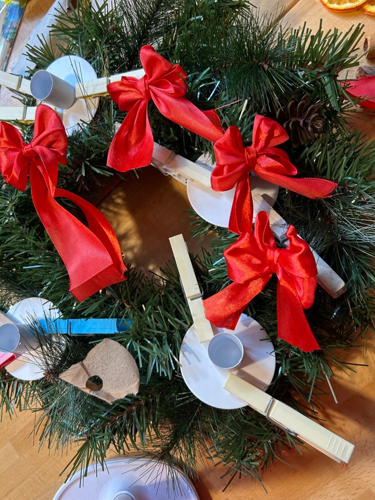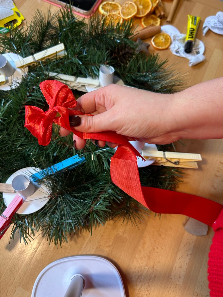 Passiamo poi al nastro! Io ho deciso di fare dei fiochi da posizionare sui porta candele, perché la lunghezza del nastro non era abbastanza da creare un bell’effetto se arrotolata intorno alla corona. Per fare i fiocchi potete seguire un tutorial qualsiasi su Youtube, ci vuole un po’ la prima volta ma poi andrete spediti! Anche questi li fermiamo con delle mollette.