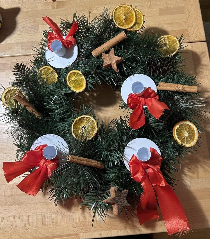 - Decorazioni varie, io ho preso da TEDI un pacchetto contenente arance essiccate, bastoncini di cannella e stelline di legno. Ovviamente potete metterci quello che volete, come ad esempio il pungitopo;