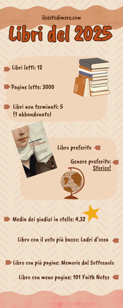 Questo 2025 è stato prolifico, non tanto per il numero di libri letti (comunque un ottimo punteggio, visto che per 8 mesi sono stata circondata da lavoro e altri impegni) ma per la qualità delle letture: bei libri, titoli che mi hanno soddisfatta e ben pochi abbandonati; un grande risultato per me, che sono una lettrice estremamente umorale e molto schizzinosa.