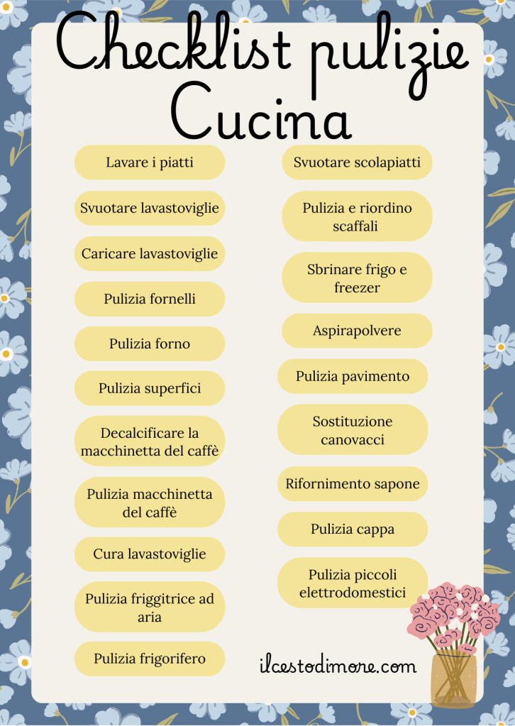 Sentitevi liberi di scaricare gratuitamente la checklist che vi lascio di seguito, di stamparla e di utilizzarla come preferite! Ovviamente questa è creata tenendo conto della presenza di vari elettrodomestici come la macchina del caffè e la friggitrice ad aria per renderla il più completa possibile, se voi non li avete semplicemente skippate la voce!